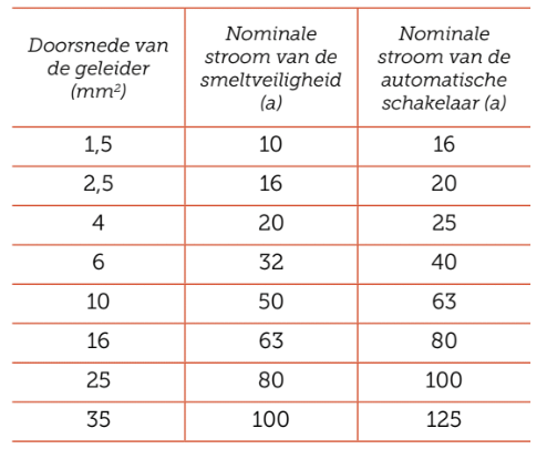 Om te weten hoe groot de nominale stroom bij je huishoudelijke installatie moet zijn, gebruik je de handige tabel hiernaast: