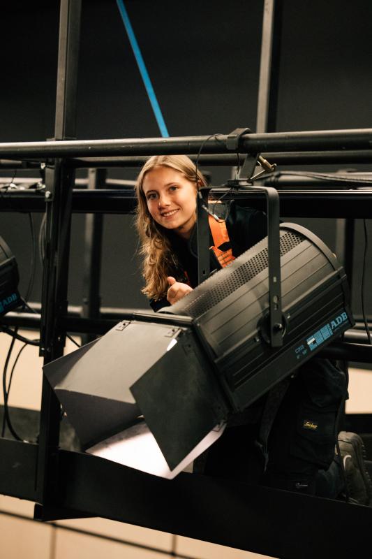 Ce qui plaît le plus à Yente ? L’équilibre entre théorie et pratique. Dans la salle de théâtre de l’école, elle peut se tromper et apprendre tout de suite. Elle a déjà participé à des comédies musicales scolaires et à d’autres projets. En dehors de l’école, elle travaille comme étudiante-indépendante sur des festivals. « C’est comme ça qu’on apprend vraiment le métier. »