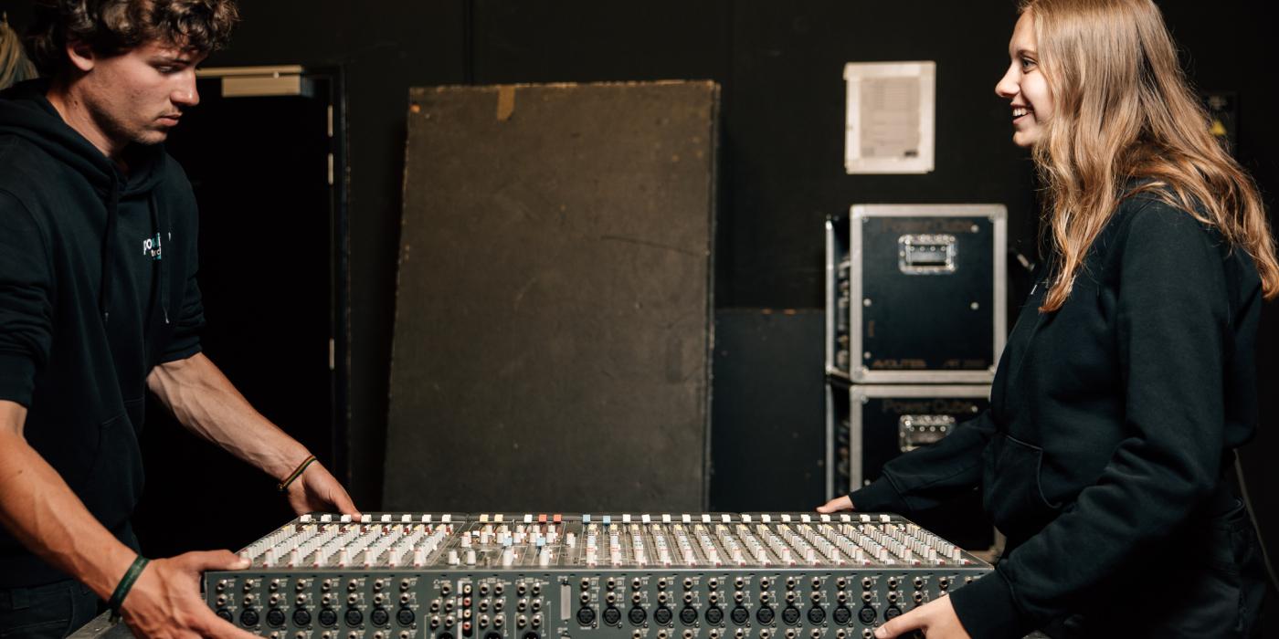 Wat Yente het meest aanspreekt? Het evenwicht tussen theorie en doen. In de theaterzaal op school mag ze fouten maken en meteen bijleren. Ze werkte al mee aan schoolmusicals en andere projecten, en buiten school draait ze als student-zelfstandige mee op festivals. “Zo leer je het vak echt kennen.”